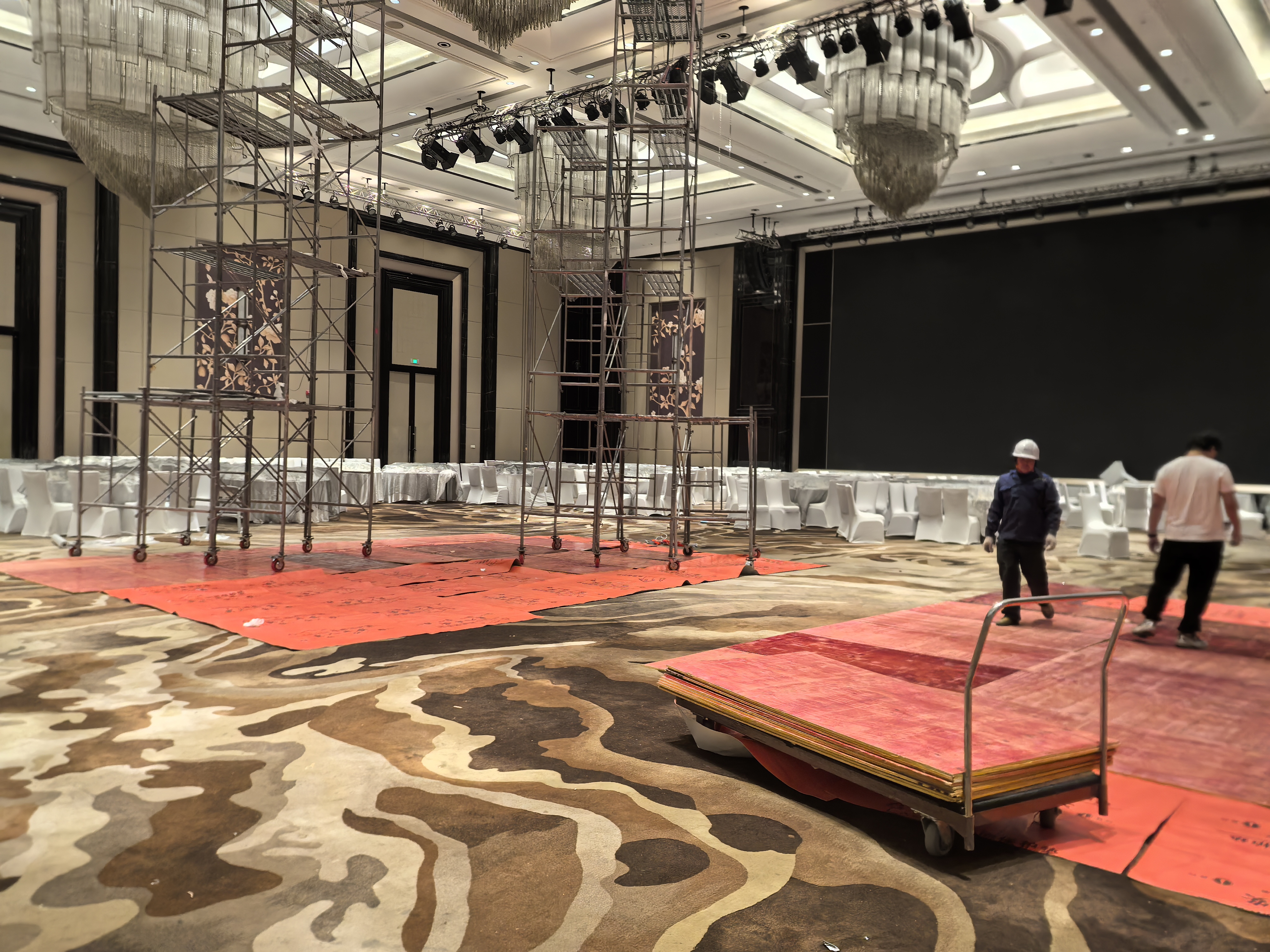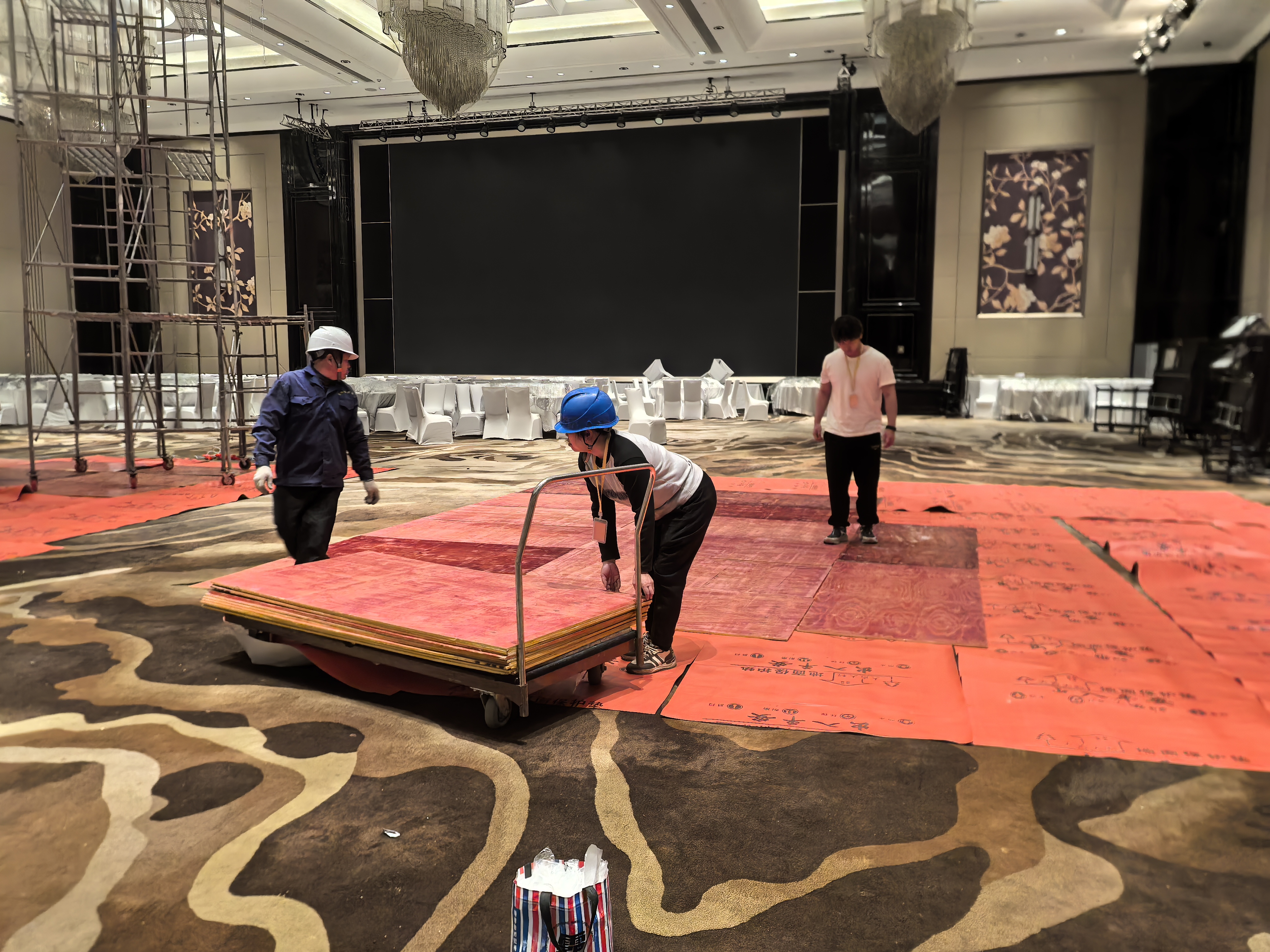 面对长沙瑞吉酒店极其严苛的标准,我们不敢有丝毫怠慢。为了保护每一寸珍贵的地毯,我们铺设了全面的防护和专用木板。